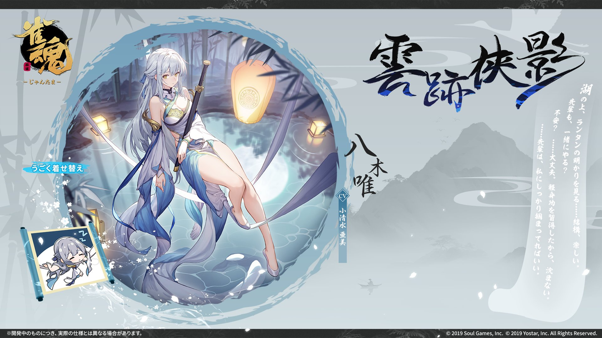 | 適当メモ | 19/5/30に追加実装の情報が発表されたキャラの一人。誕生日は10月12日。 19/5/31より実装、ガチャ「落桜の道」にて入手可能。 ケモ耳帽子は邪道だと思いますっ! ボイスはかなり落ち着いた低音系。 占い的なセリフを主体としているものの、占い師にしてはかなり露出が多めである。 公式のキャラ紹介はこちら(英語版・中国語版)。 キャラ紹介立ち絵ミラー 絵師はこのような情報からliduke(日子)さんの可能性があるが確定ではない。 |